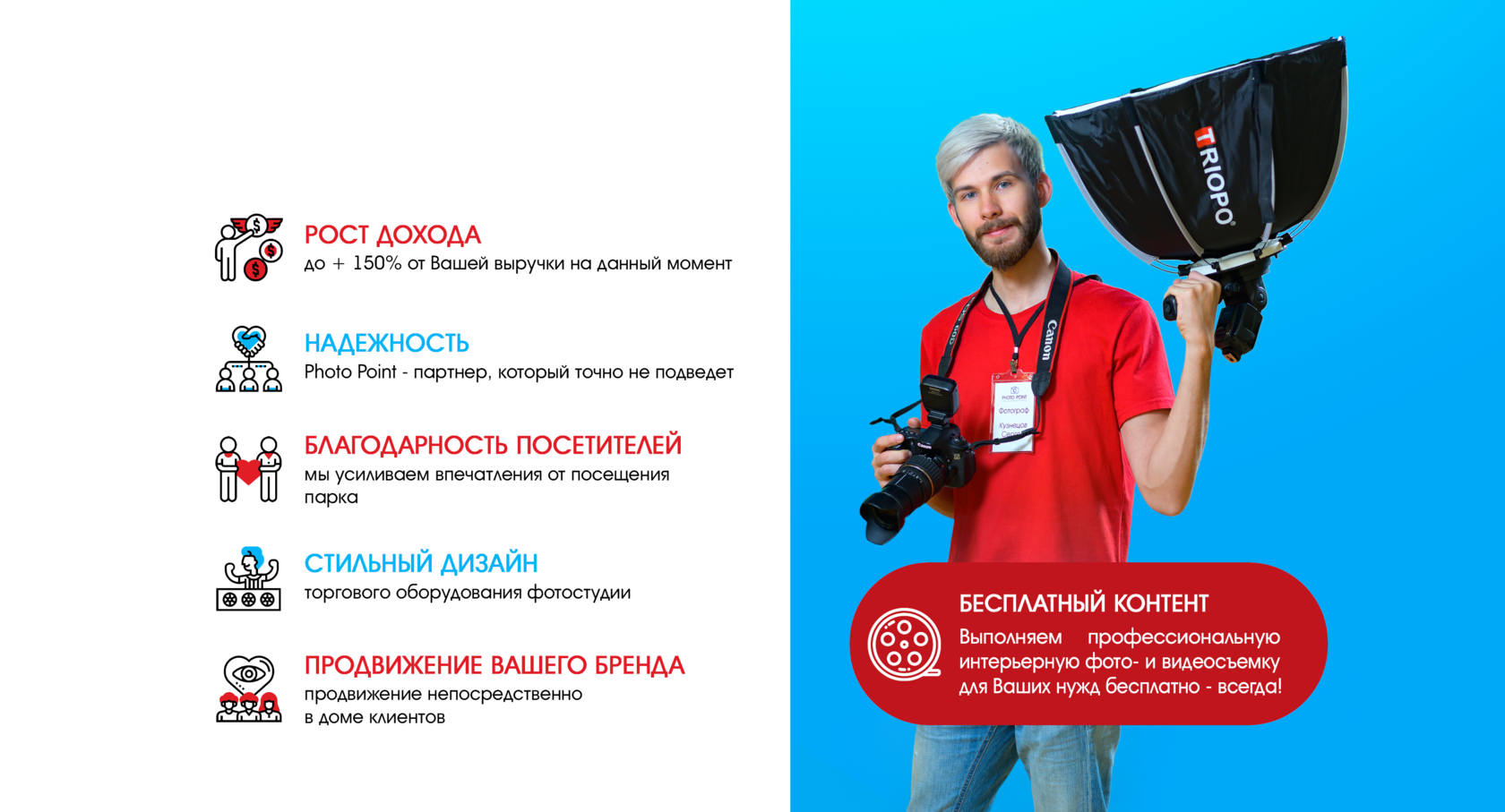 Собственная разработка Photo Point - камера автоматической фотофиксации: съемка живых эмоций с моментальной трансляцией на экран и передачей на печать.